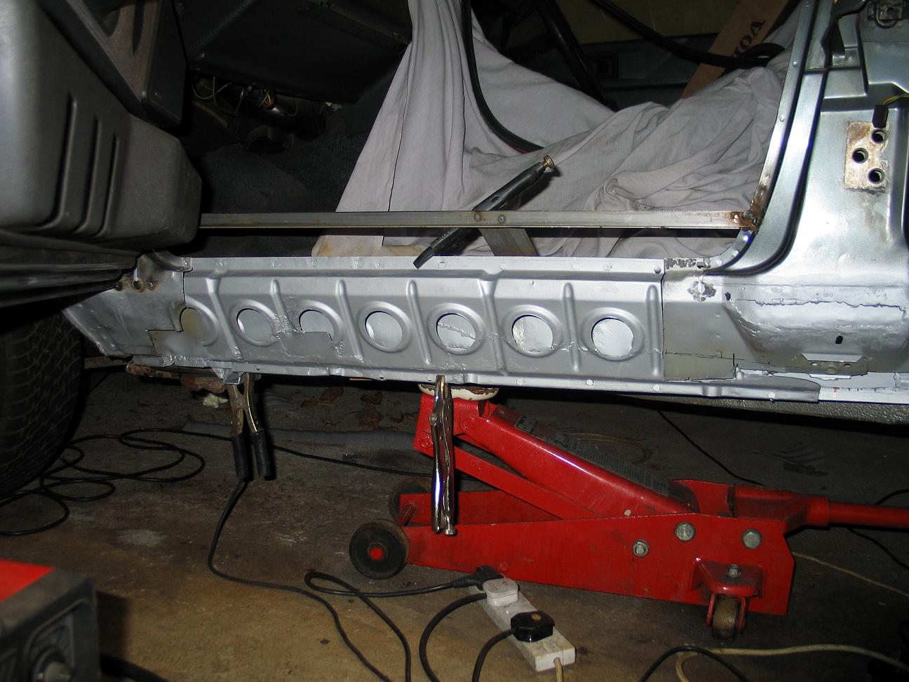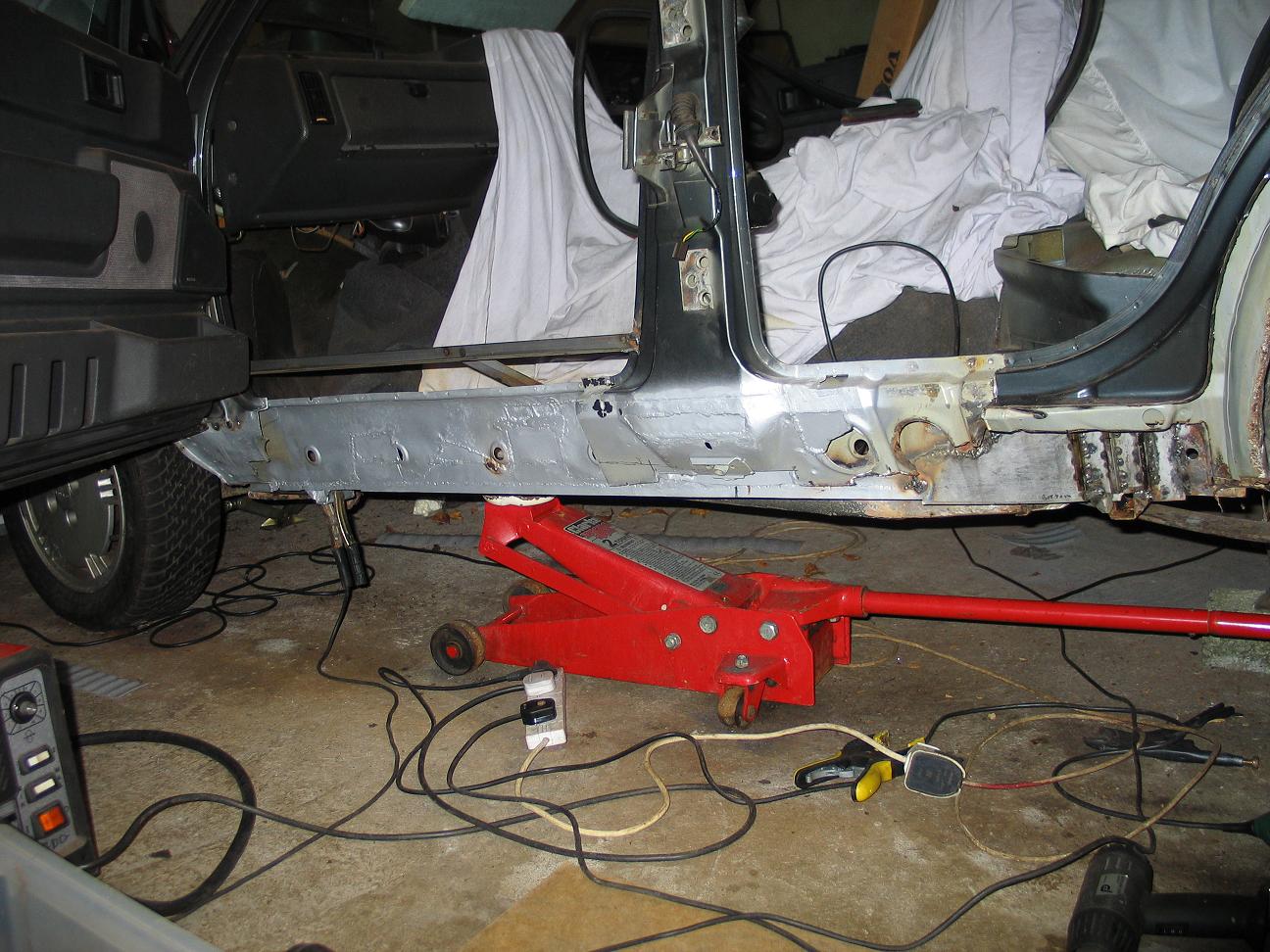 Boot nightmare, have previously replaced all rear facing panels Sill progress, had to rebuild the floor pan corners, bottom lip, both jacking points. Braced the doorway, jacked up the gear box/engine and a little jacking force under the passenger area. Repair section recovered from older car, cover in weld through zinc primer Working on rear jacking point at the moment, also waiting for some galvanising paint to add before reducing access.