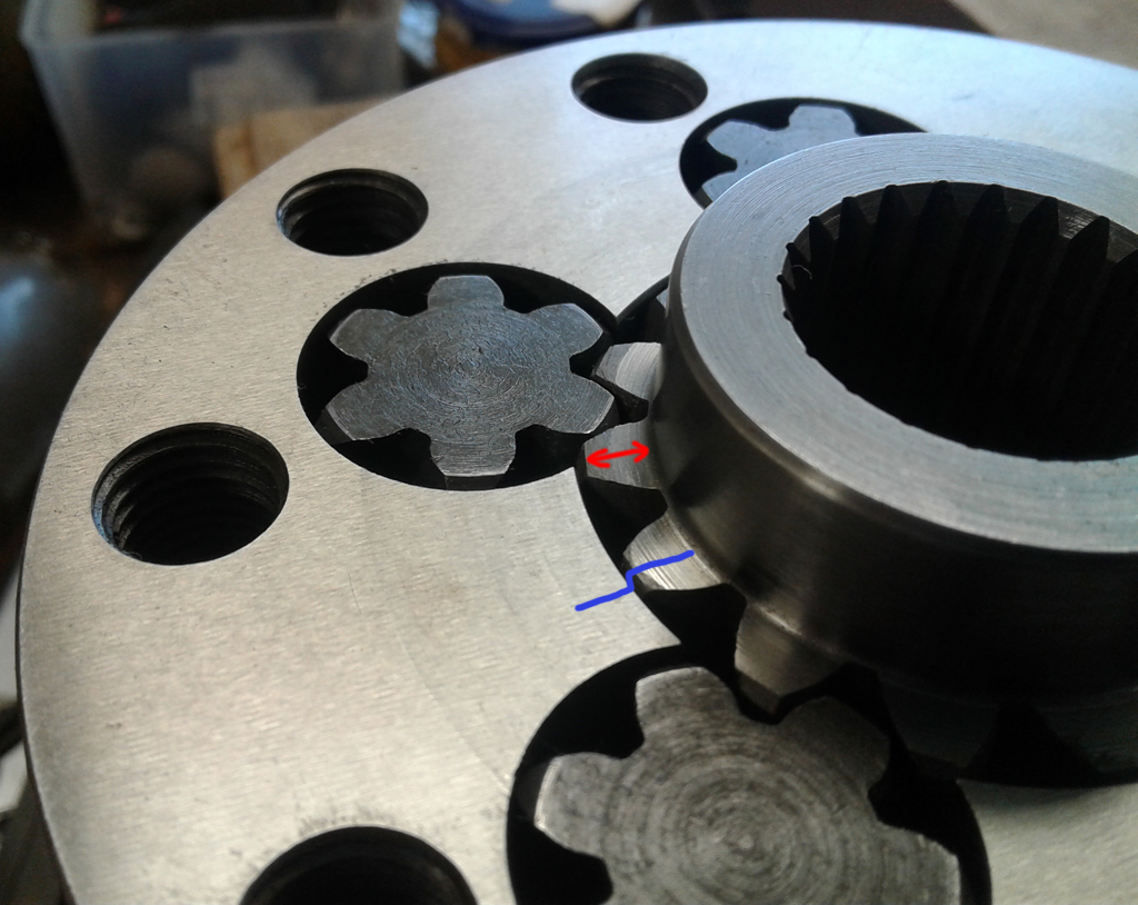 If you look at the blue line you can see that the "center gear" is not flush with the smaller ones ore even the face of the diff. That makes that gear squeezed between the spacer and the seat in the diff housing (next picture) If I push my hand to the spacer like this and twist, the gears is turning because of the spacer is riding on the teeth of the center gear: ''