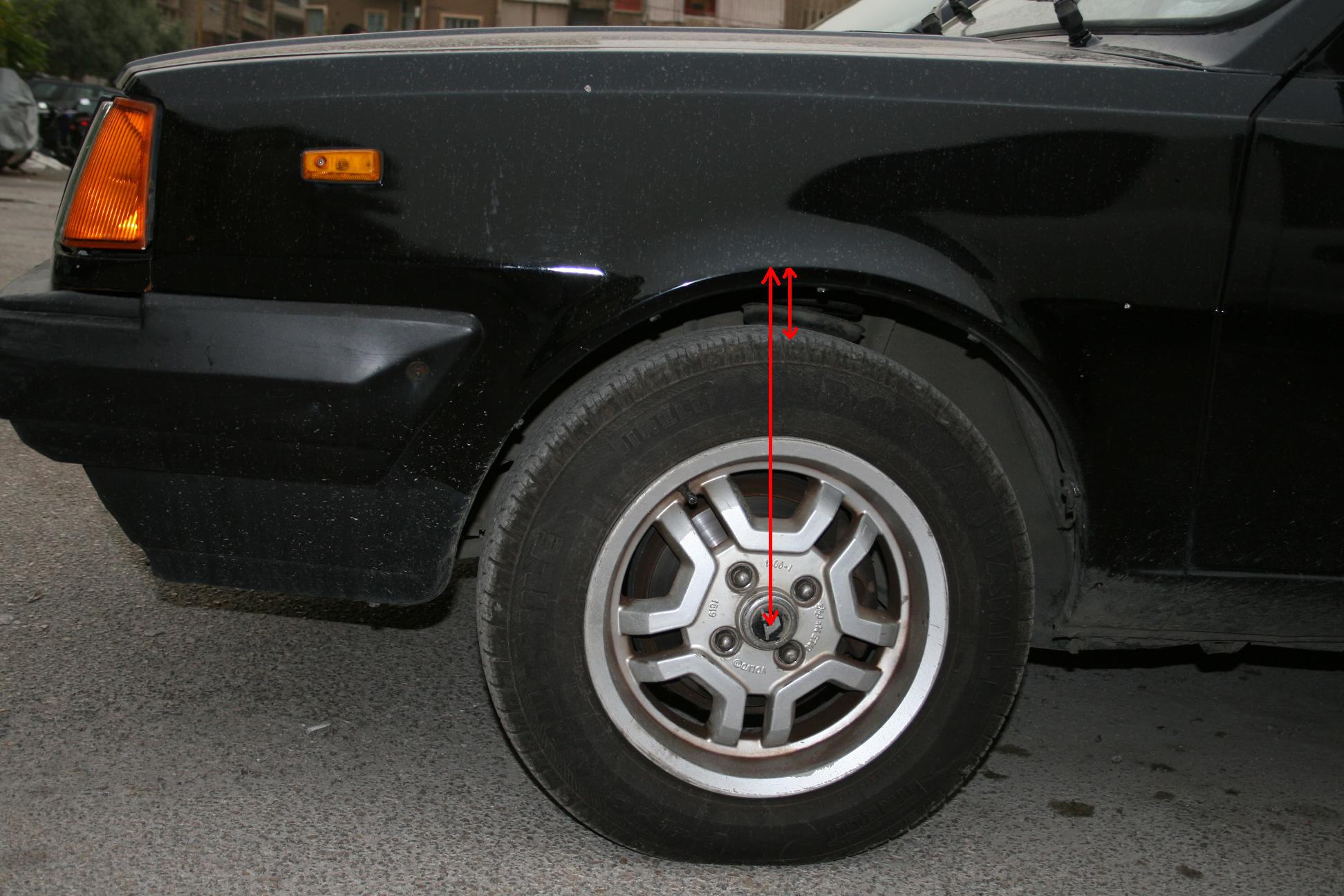 well on my gle the measure ment between wheel center to the arch directly above is 36cm. IIRC a glt is 1" lower so i recon the measure ment as standard/when new should ahve been about 33/34 cm.