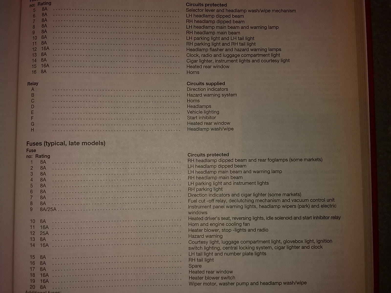 Unfortunately I don't have the original owners manual, I have a Haynes manual, but unfortunately it's completely wrong for my fusebox.