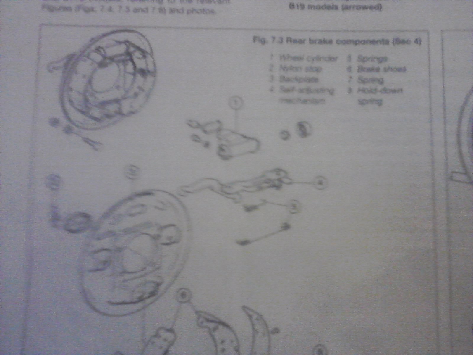 spring 7 is low down the shoe well away from the Nylon stopper in my picture, but I can't see your picture clear enough, because when I try to expand etc your pi' it gets very blured. You will see in my picture that the Nylon stopper enters the back plate though the rubber boot where the hand brake lever comes through. TYhe small spring that attaches to the hand brake lever is the only spring anywhere near the Nylon stopper, but that too would never reach the `stopper`, though I do understand what you mean by it being held in place with some kind of spring that isn't shown in the `kneeling` manual