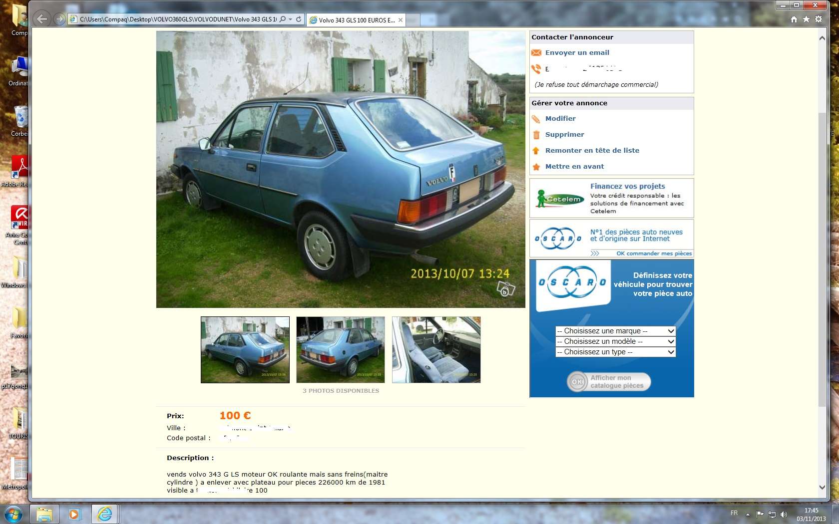 une volvo traine un peu de partout ici et là et même la bas et ailleurs et sur LBC , suie à mes annonces de recherches on me la propose 4 fois le prix départ des annonces en oubliant certains 'tis détails ....